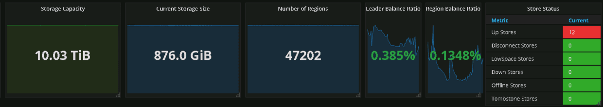 TiDB 拥有很完善的监控平台,可以直观的看到容量,以及节点状态。