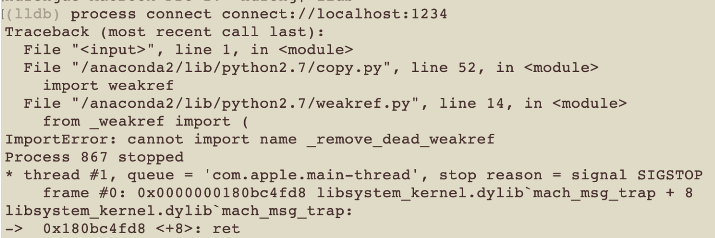 之后等待,当终端出现 Process 867 stopped 类似这种就说明连接成功了,执行c即可让APP继续运行。