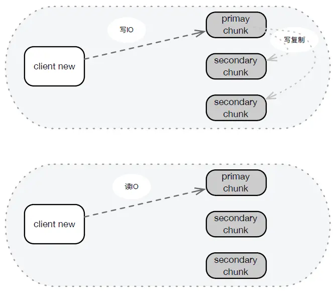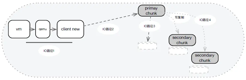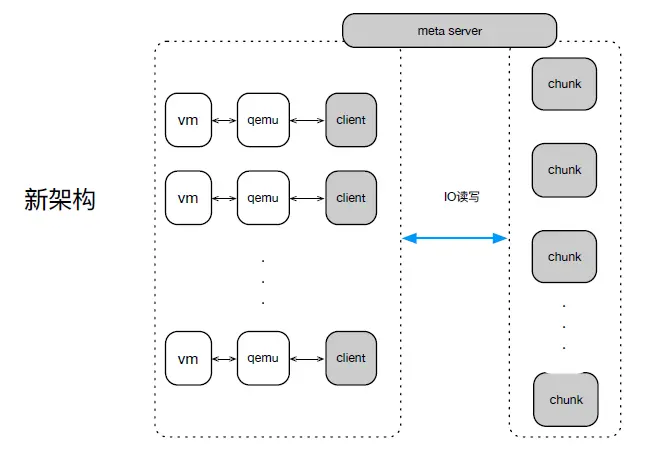 而新架构中,路由获取交给了Client,IO读写Client可直接访问存储Chunk层,写三份复制也交给了Chunk。整个IO路径变成了2层,一层是宿主Client侧, 另一层存储Chunk层。