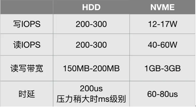 近10年,硬盘经过 HDD -> SATA SSD -> NVME SSD的发展。同时,网络接口也经历了10G -> 25G -> 100G的跨越式发展。然而CPU主频几乎没有较大发展,平均在2-3GHZ,我们使用的一台物理机可以挂6-8块NVME盘,意味着一台物理机可以提供300-500万的IOPS.