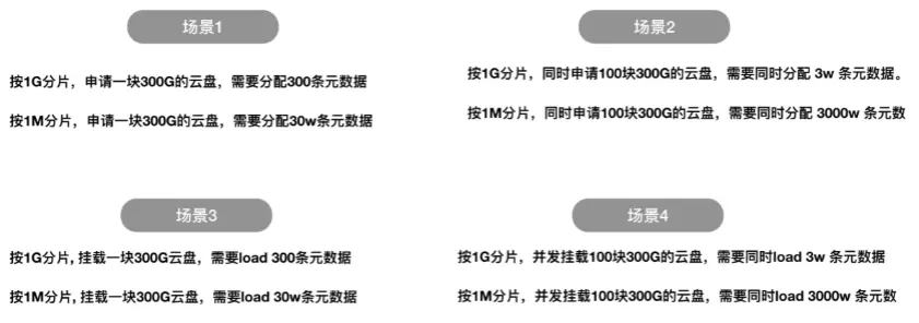 例如,同时申请100块300G的云盘,如果按1G分片,需要同时分配3W条元数据;如果按照1M分片,则需要同时分配3000W条元数据。