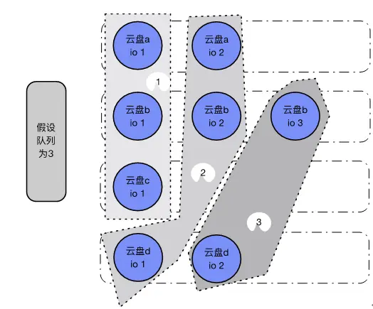 对于普通云盘,需控制并发提交队列大小,按队列大小,依次遍历所有云盘,下发各云盘的IO,如上图的1、2、3。实际代码逻辑里,还需要考虑云盘大小的权重。