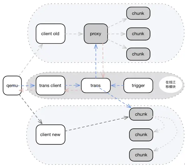 5 当全部搬迁完成后,Qemu连接重置到新架构Client,完成在线迁移。