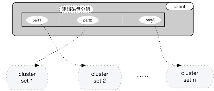 因此,我们计划将用户申请的逻辑盘,进行分Part, 每个Part可以申请再不用的Set中,从而具备容量可以无限扩展的能力。
