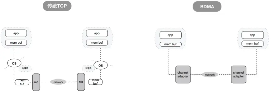 RDMA提供了一种消息服务,应用程序利用RDMA可以直接访问远程计算机上的虚拟内存,RDMA减少了CPU占用以及内存带宽瓶颈,提供了很高的带宽,并利用Stack Bypass和零拷贝技术,提供了低延迟的特性。