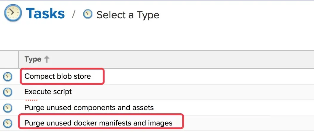 最后,创建两个Nexus Task 来清理物理空间。先运行 Purge unused docker manifests and images,再运行 Compact blob store。