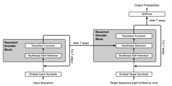 模型的结构还是和传统Transformer很相似,这里就不重复解读了,主要讲一下universal transformer的几点改动: