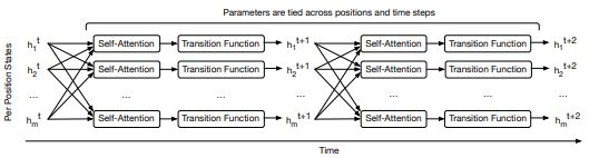 在Transformer中,input在经过multihead self-attention后会进入fully connected层,这里则进入了Transition层,通过一个共享权重的transition function继续循环计算: