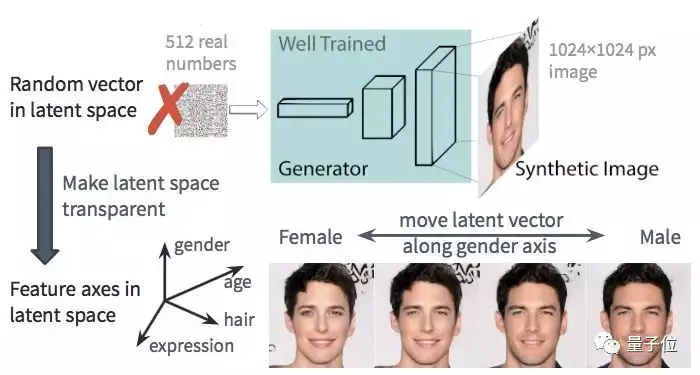 作者在模型上使用的是英伟达的的pg-GAN(progressively-growing GAN),其生成的1024px × 1024px图像的特征由潜在空间中的512维噪声矢量(一种图像内容的低维表示)来确定。如果能够理解这些都代表着什么,就能完全控制生成过程。