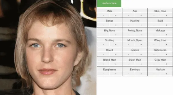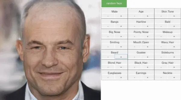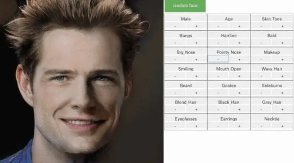 在进行测试的过程中,虽然效果很好,但出现了一个非常让人头疼的问题:特征轴纠缠(entangled feature axes)。即不同的特征轴之间会相互影响,例如当你打算减少胡须特征的时候,图像就会变得越来越像女性,或者调整Pointy Nose (尖鼻), 也会把男生变成女生。