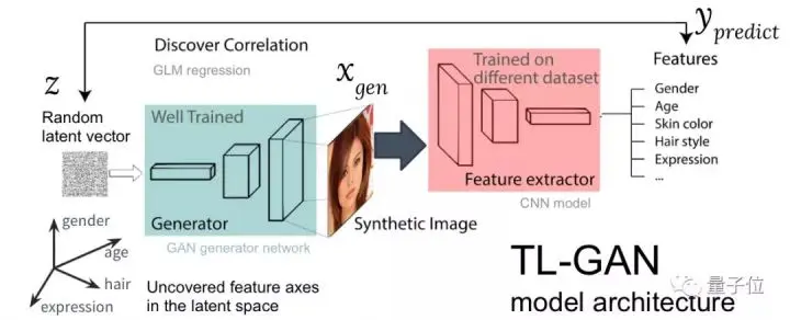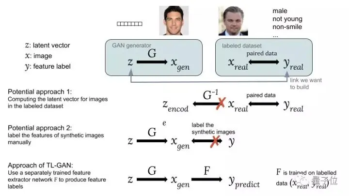 作者表示,为解决这个问题,TL-GAN模型的关键创新是,使用现有的标记图像数据集( x_real,y_real ),来训练一个独立的特征提取器模型y=F(x),然后将训练好的GAN生成器G与特征提取器网络F耦合。