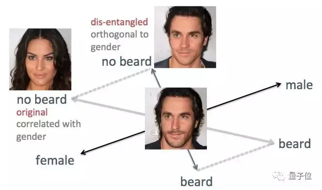 为了解决这个问题,作者表示自己使用了线性代数技巧:将胡须轴映射到一个垂直于性别轴的新方向,这可以有效消除它们的相关性。