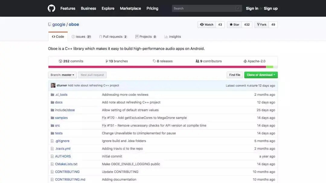 - 在 Github 上获取 Oboe 库: github.com/google/oboe