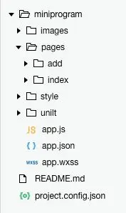 我们页面代码写在pages文件下,目前有新增add与首页index两个页面,每个页面包含 wxml、wxss和一个js文件。wxml写页面结构,wxss写样式,js作为控制。