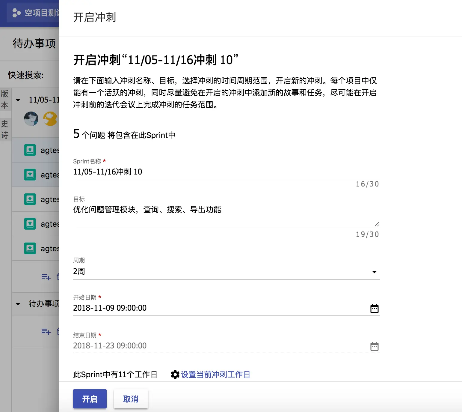 迭代会议结束后,团队正式进入到这个迭代的开发中。Choerodon猪齿鱼敏捷管理中,把一个正式开启的迭代称作为一个活跃冲刺,一个看板针对一个活跃冲刺。团队根据计划制定这个迭代的目标和时间范围。