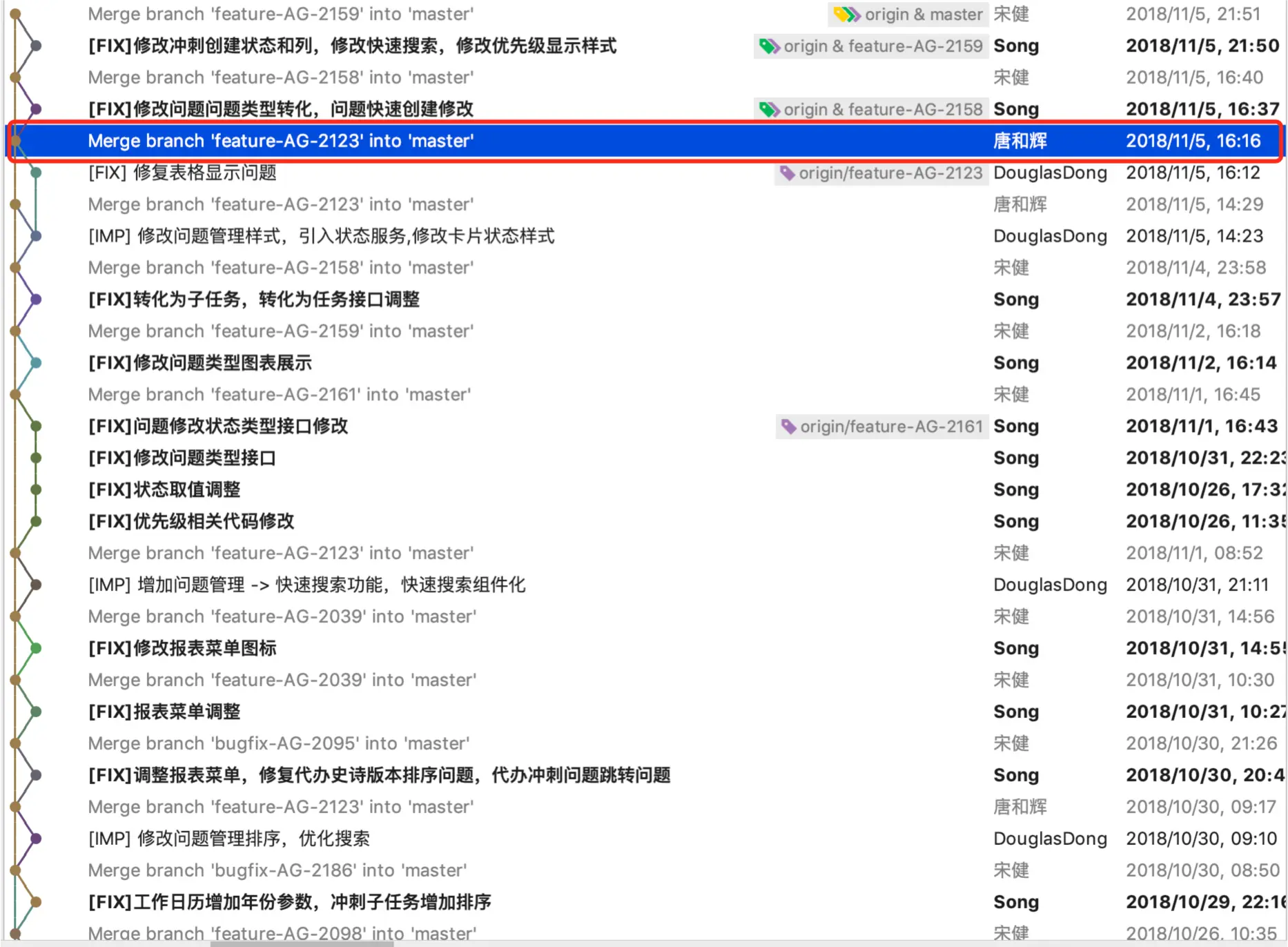 Choerodon敏捷开发中,开发人员会在每天定点提交合并代码(即使只完成部分功能)。如下图的代码提交日志会记录每个人提交合并的时间,会对提交代码部分进行备注,这样可以提高多个开发人员的合作效率: