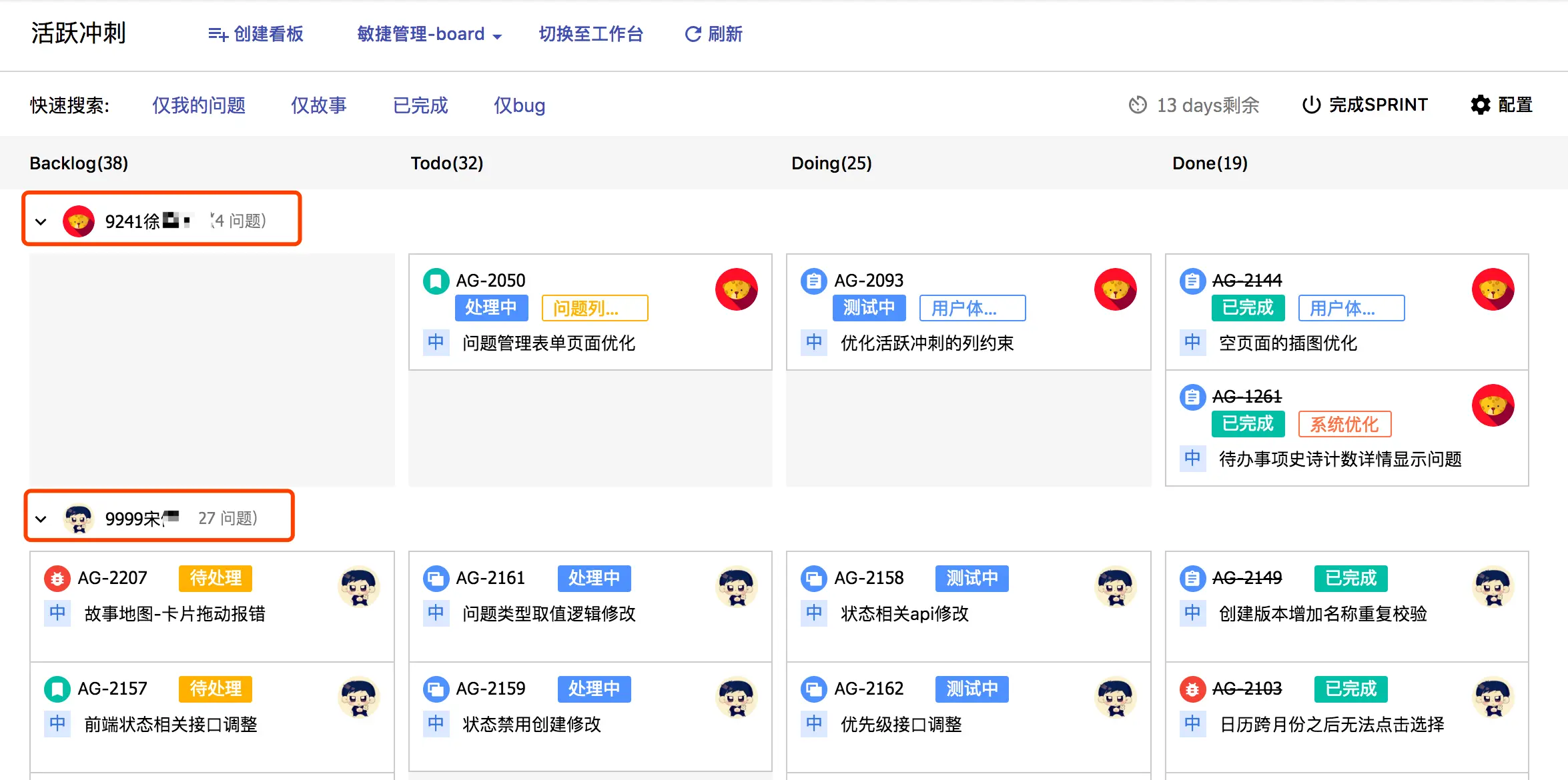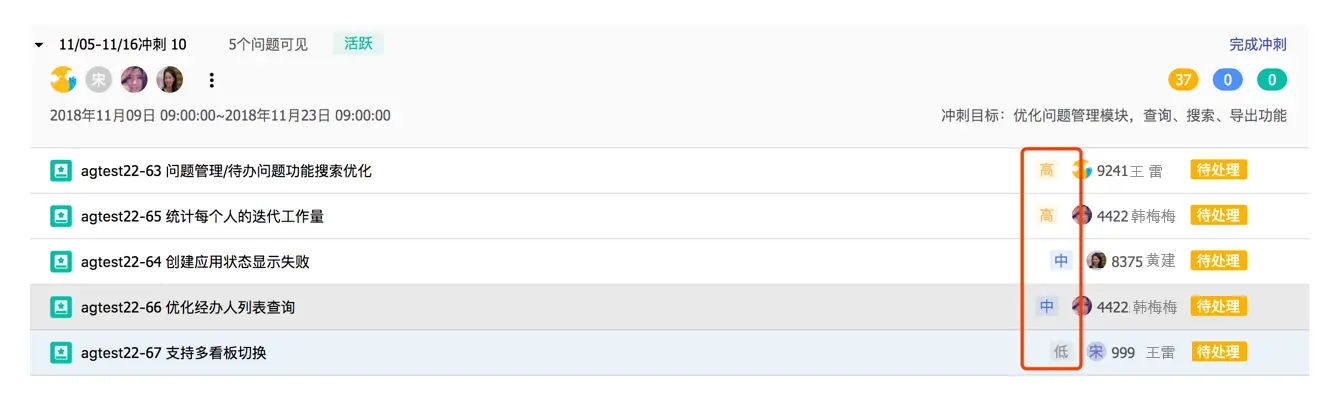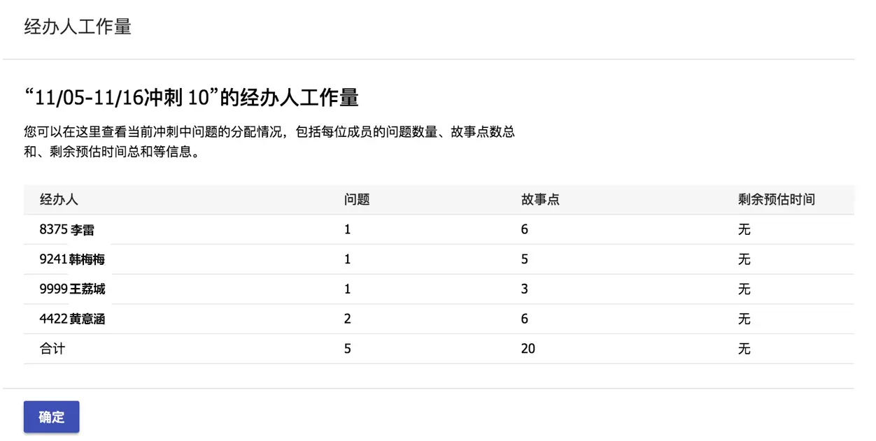 在活跃冲刺中,团队可以实时查看每个成员的任务量,从而掌握团队进度以及瓶颈。