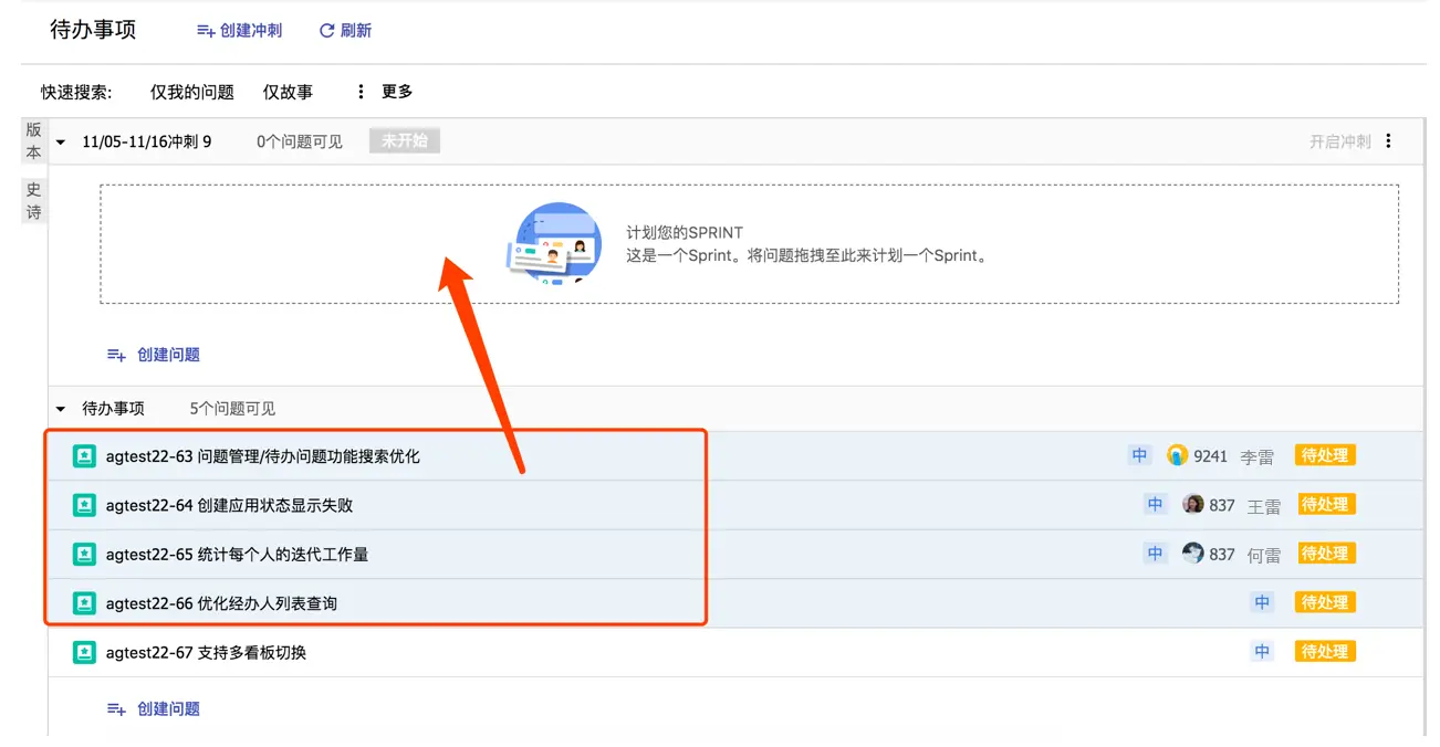 在实际的操作中,团队计划会议后会开启一个冲刺,将backlog中确定在该冲刺进行的故事拖到冲刺列表中,随后为每个故事进行分解并关联对应的任务。