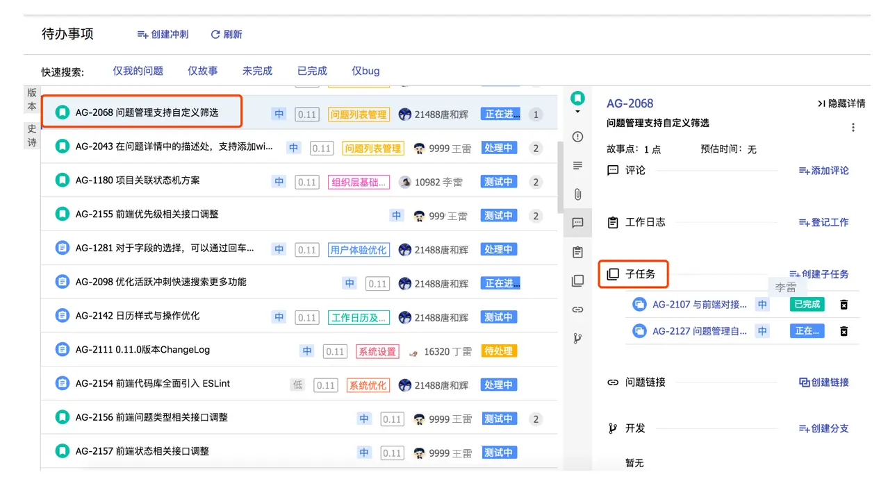 理解用户故事的大致内容后,需再将故事分解为任务。在Choerodon敏捷管理中,可以通过创建子任务的方式来分解故事,并将故事与这些拆分后的任务进行关联。只有当所有的子任务状态变成已完成时,这个故事才能拖到已完成的列中。