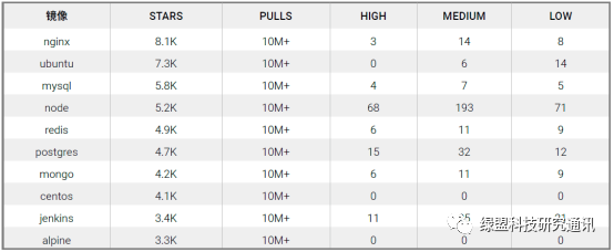 作为容器运行的基础,容器的镜像安全一直以来备受使用者的关注,有关研究报告[1]显示,Docker Hub中超过30%的官方镜像包含高危漏洞,接近70%的镜像有着高危或中危漏洞。我们从Docker Hub中选择评价和下载量较高的10个镜像,对其最新版本(latest)采用Clair工具进行了扫描分析。从结果可以看出,如此高频率使用的镜像,绝大多数均存在高危漏洞,有的镜像高危漏洞数量甚至达到数十个之多。