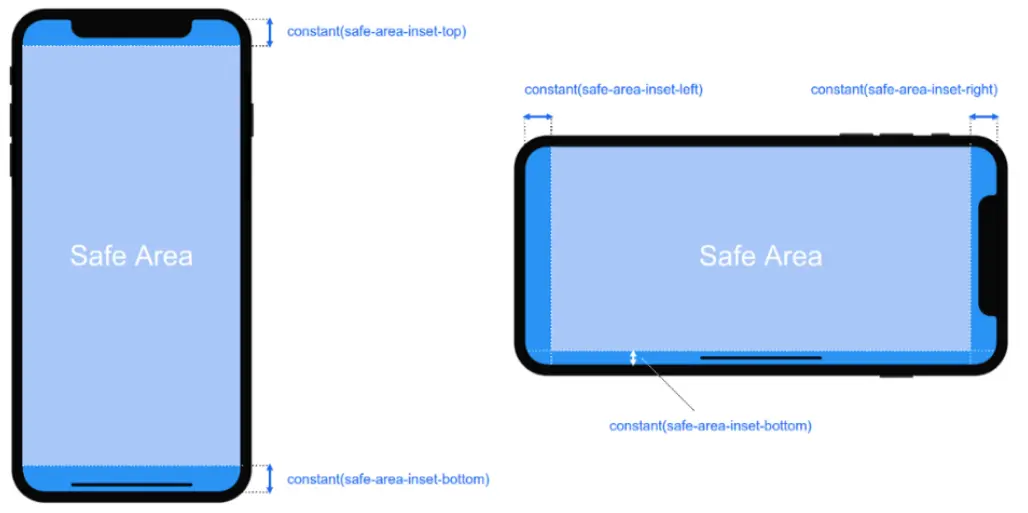 各种 iphone x 都是不规则形状,我们如何控制页面元素到安全区域呢?apple 把安全区域的位置通过 css 属性提供给了开发者,它们可以通过CSS的constant( )函数来完成: