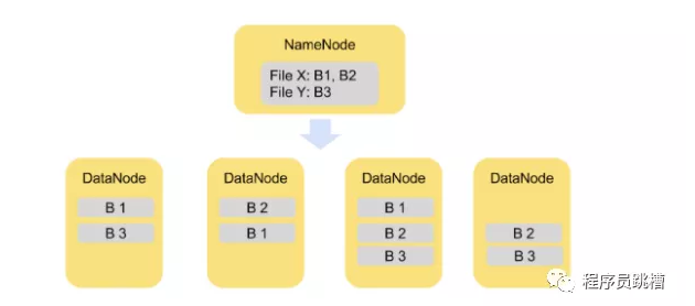 图2说明了将文件拆分为块的概念。文件X被分成块B1和B2,文件Y仅包括一个块B3。所有块都在群集中复制两次。