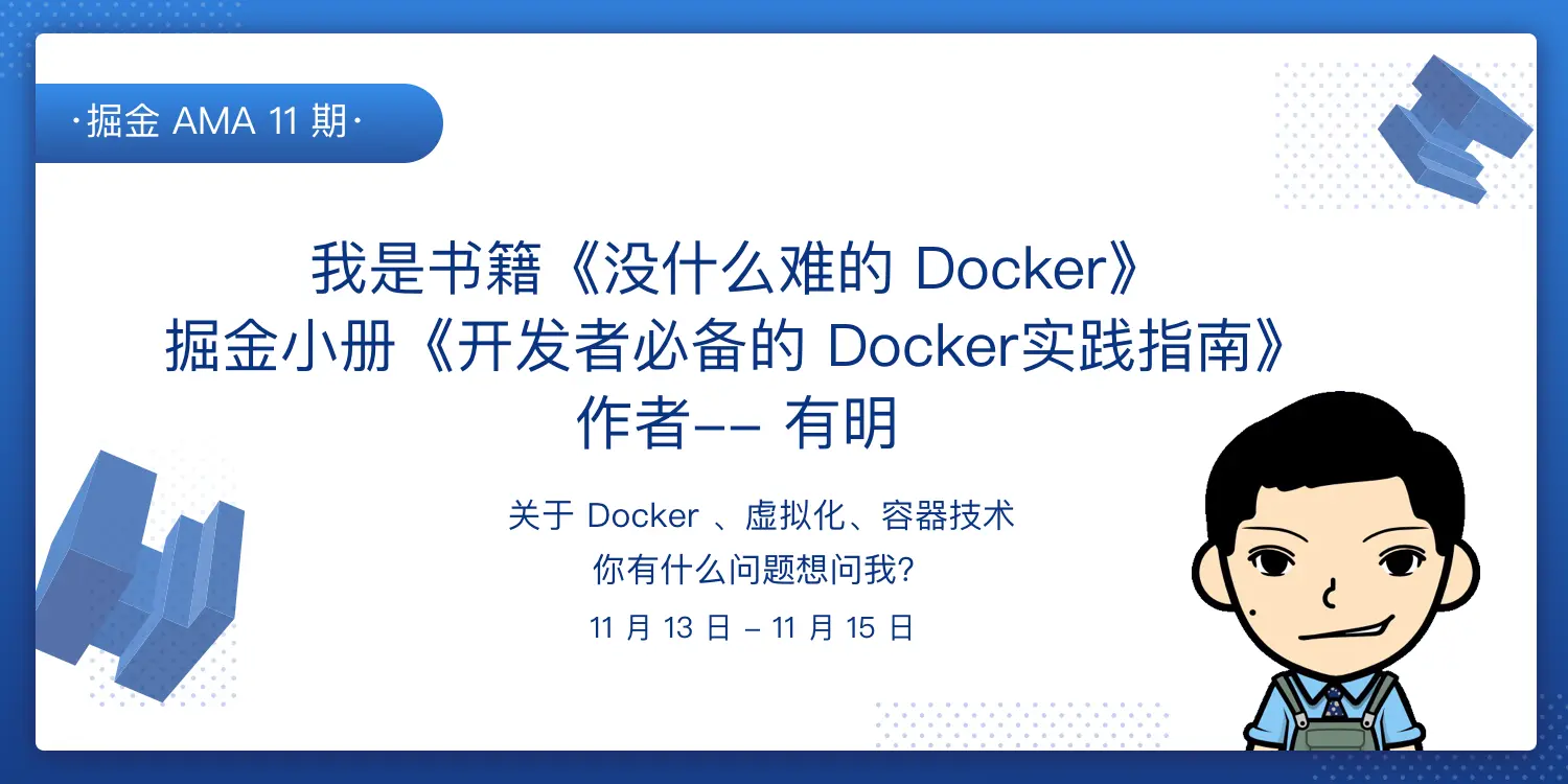 掘金 AMA 第十一期嘉宾是《没什么难的 Docker》书籍、《开发者必备的 Docker 实践指南》小册作者-- 有明。