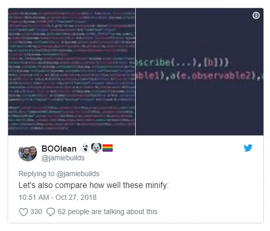 就部署大小而言,对 Hooks 的支持仅仅增加了 React 约 1.5kB(min + gzip)的大小。虽然不多,但由于使用 Hooks 的代码通常可以比使用类的等效代码压缩得更小,所以使用 Hooks 也可能会减少你的包大小。下面这个例子有点极端,但它有效地展示了我这么说的原因(点击查看整个帖子):