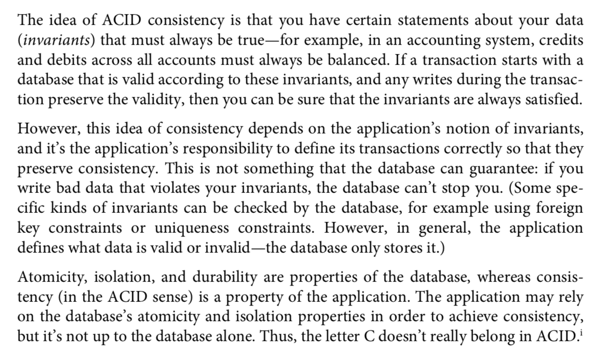 ACID和CAP中的C是都是Consistency的缩写,但是他们的含义却是截然不同的。ACID包含Atomicity(原子性)、Consistency(一致性)、Durability(持久性)、Isolation(隔离性)四个方面,其中Atomicity(原子性)、Durability(持久性)和 Isolation(隔离性)都是存储引擎提供的能力保障,但是Consistency(一致性)却不是存储引擎提供的,相反,它是业务层面的一种逻辑约束,以转账这个最为经典的例子而言,A有100元RMB,B有0元RMB,现在A要转给B 50元RMB,那么转账前后,A和B的总钱数必须还是100元RMB,显然,这只是业务层规定的逻辑约束而已。在《DDIA》一书中,对ACID也有着如下的描述: