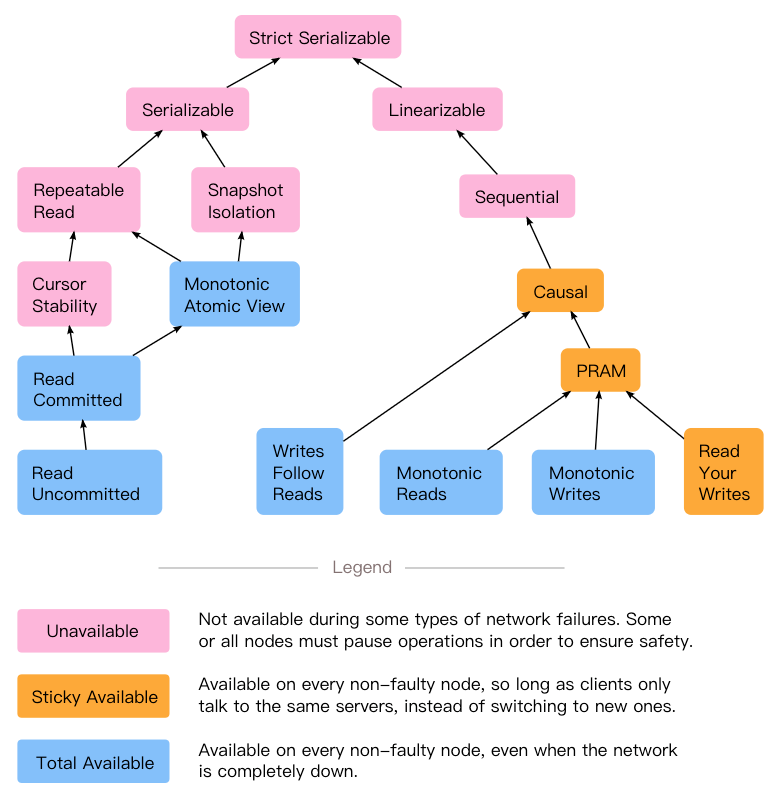 从jepsen官网的那张图可以看到,Casual Consistency(因果一致性)和PRAM下面还包含了Writes Follow Reads、Monotonic Reads、Monotonic Writes、Read Your Writes等一致性模型,这些都比较简单,鉴于篇幅原因本文不再赘述。