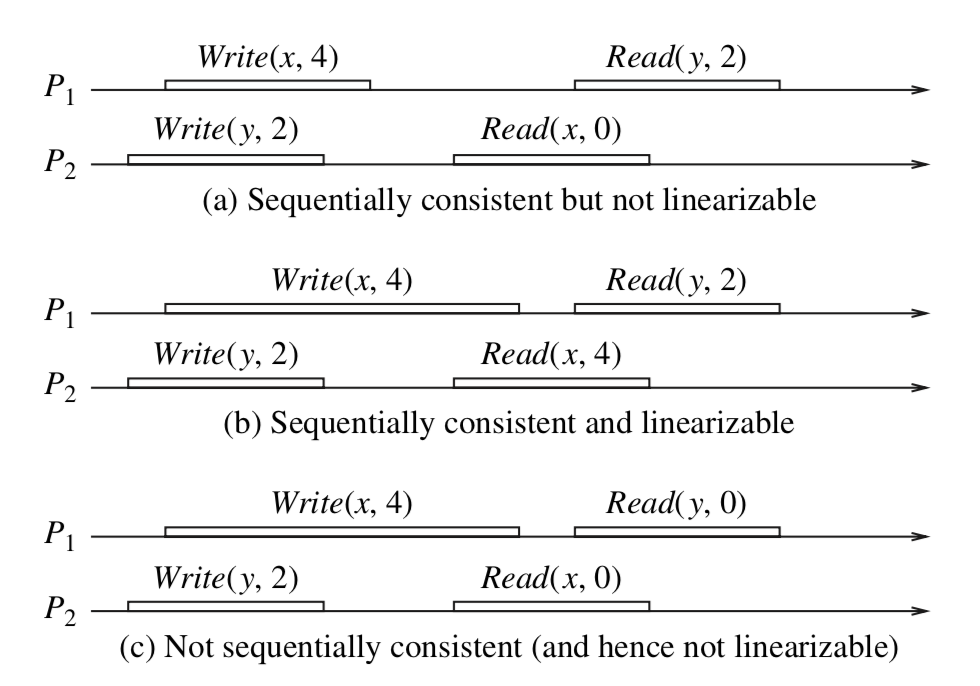 引用《分布式计算-原理、算法与系统》一张图进一步说明Linearizability Consistency(线性一致性)和Sequential Consistency(顺序一致性)之间的区别: