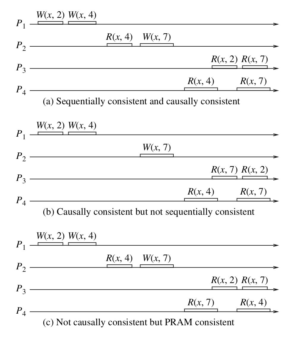 图c展示了比Casual Consistency(因果一致性)更弱的一种一致性模型: PRAM(Pipelined Random Access Memory)管道式存储器,是Lipton和Sandberg于1988年在学术报告”PRAM: A scalable shared memory”中提出。如前所述, Sequential Consistency(顺序一致性)要求所有进程看到的程序执行顺序必须一致,而Casual Consistency(因果一致性)降低了一致性要求,它要求有因果关系的操作在所有进程上看到必须一致,而PRAM Consistency进一步降低一致性要求。先看PRAM定义:“…Writesdone by a single process are received by all other processes in the order inwhich they were issued, but writes from different processes may be seen in adifferent order by different processes.” 意即在PRAM中,不同进程可以看到不同的执行顺序,但在某一进程上的多个写操作,在所有进程上看到的顺序必须一致,而不同进程上的写操作在不同进程上看起来其执行顺序则可以不一致。图c展示的例子而言,从P3角度看到的P1和P2操作顺序为:Write(x,2)、Write(x,4)、Read(x,4)、Write(x,7),这是满足Casual Consistency(因果一致性)的。从P4角度看为:Write(x,2)、Read(x,4)、Write(x,7)、Write(x,4),这显然不满足Casual Consistency(因果一致性)的要求。