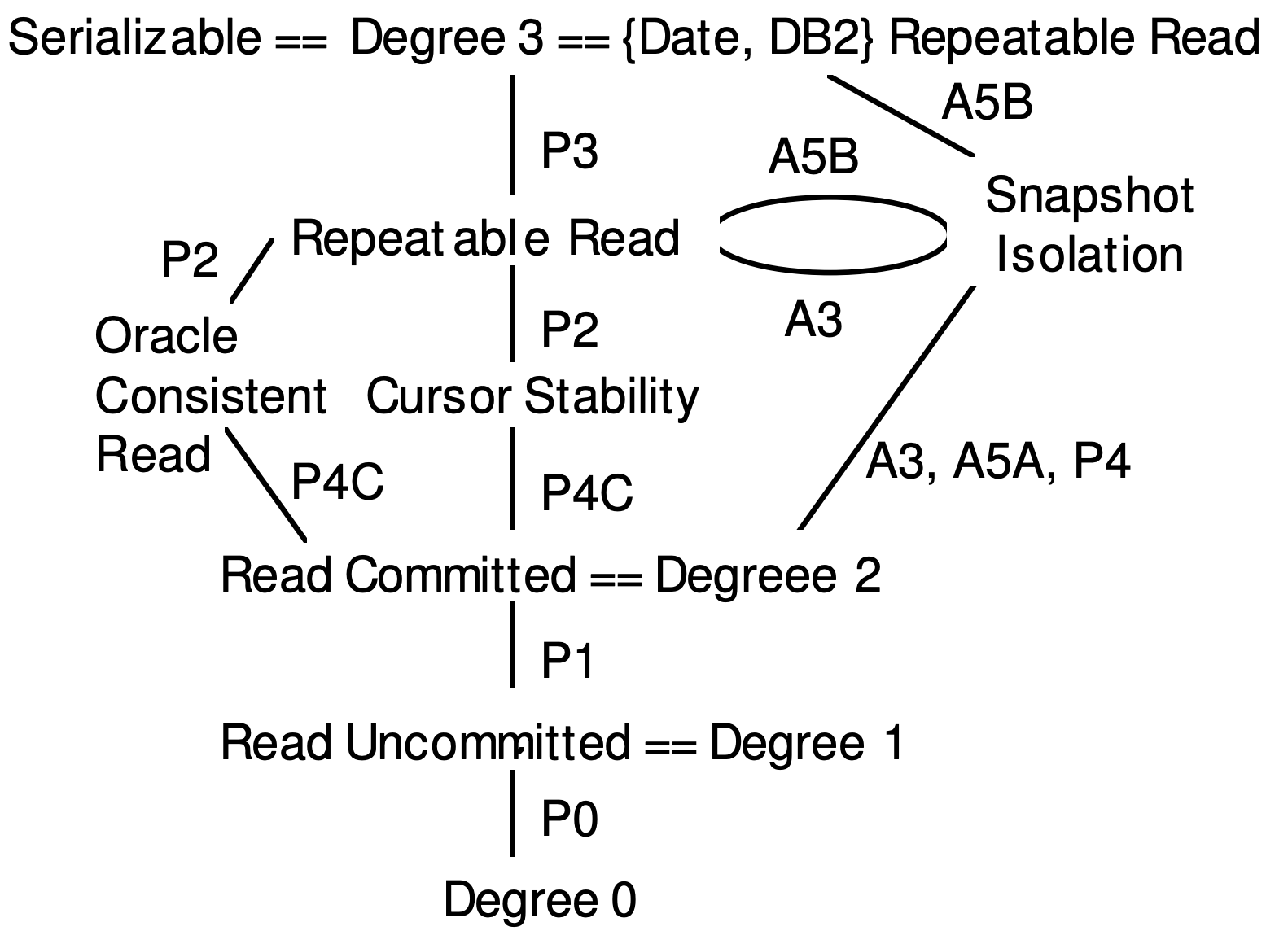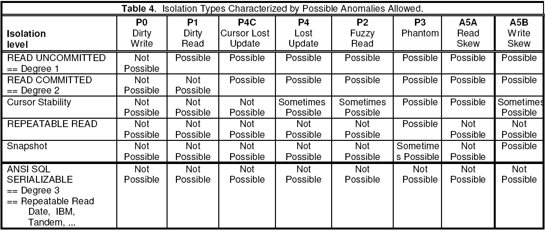 前文提到了,Serializable是一种事务隔离级别(并发的事务之间),是ACID中的Isoloation的意思。但是最开始ACID的Isolation只有4中隔离级别,随着技术的演进,出现了很多当初的标准没有定义的新的隔离级别,诸如snapshot Isoloation等。下表详细概括了6种隔离级别,每种隔离级别强度层层递进,但也存在或引入某些新的问题,以snapshot Isoloation为例,它能解决repeatable read存在的幻读问题,但是却存在write skew的问题。
