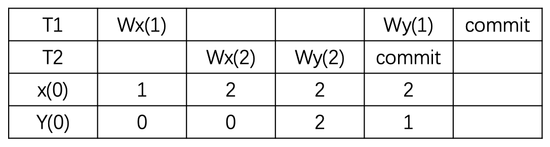 现象:最开始的阶段是一切皆有可能发生,没有任何锁,所以碰到的第一个问题是脏写。当一个事务覆盖写了另一个正在运行的事务写入的值时就会发生脏写。比如下面的例子,事务一致性的约束性条件是x必须等于y, 一开始x和y初始值都为0,之后事务T1 准备写入 x=y=1 并且事务 T2 准备写入 x=y=2,但是由于T1和T2都没有对数据加锁,因此导致互相发生覆盖写(脏写),导致最终都成功commit之后,x==2,y==1,违反了约束性条件。