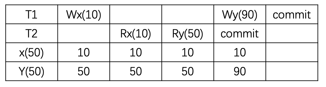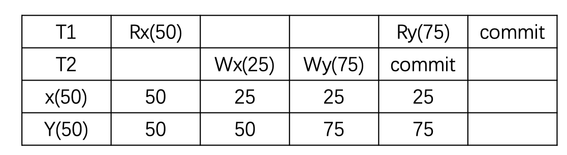 现象:读偏也是在实现read commited后可能出现的现象。 假设现在的约束是x+y=100,事务T1先读x为50(T1对x加短期读锁),然后事务T2将x改写为25(T2对x加长期写锁),将y改写为75(T2对x加长期写锁),对事务T2而言,x+y=100是满足约束的,所以它可以成功提交。T2提交成功之后(所有的锁也都释放了),此时T1还在运行,T1读y为75,x+y>100,不满足约束。