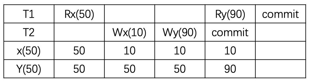 现象:在使用短期读锁和长期写锁实现read commited之后就可能存在这种异常。比如下面的例子,事务一致性的约束性条件是x+y=100, 一开始x和y初始值都为50,T1读x为50(对x加短期读锁),之后事务T2对x和y都做了修改(对x和y加长期写锁),然后成功提交。 之后T1读y为90,此时对T1而言,x+y=140不满足约束条件,因此出现不可重复读。(注:因为此时T2已经commit,因此这不属于脏读read uncommited,注意和上面的例子做区分。同时还要注意,很多人认为只有对同一个对象读多次出现值不一样才算不可重复读,其实这是狭隘的理解,其实可以多次读不同对象,只要多次读会改变一致性约束就算不可重复读)