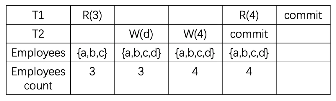 现象:幻读发生在正在执行的事务 T1 有断言读 (如select where) 时,另外一个事务 T2 执行了和断言集合有交集的插入操作。比如 T1 在 T2 插入d之前读到了员工总数是 3,但是 T2 执行的时候有交集,插入了新的数据d,这个时候员工总数是 4,但是 T1 如果再读取的话,就会发现员工总数变成了 4,而不是最初的 3,这就是幻读。