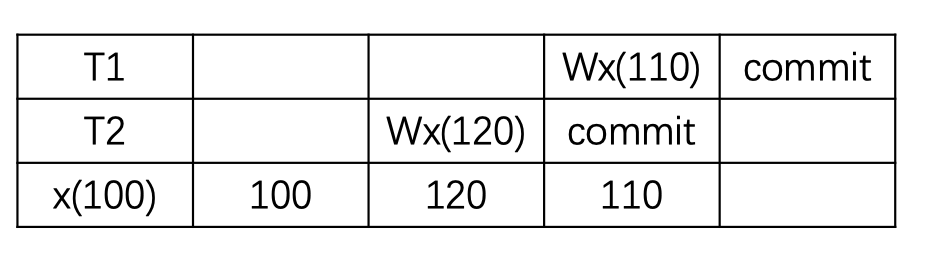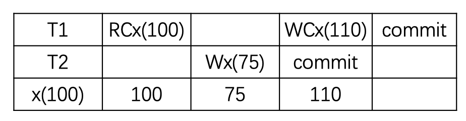 现象:事务 T2 提交的写被其他事务覆盖,首先,这不是脏写,因为 T2 已经提交,其次没有脏读,因为在写之后没有读操作,这样的现象称为更新丢失。