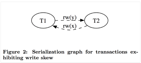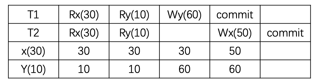 现象:这个和读偏类似,只不过,它是一种业务逻辑层面上的不一致。事务T1和T2一开始都有自己的版本,T1读x为30,并将y从10改为60,从T1自身角度看并没有违反约束(x+y<=100)。同样,T2中先读y为10,并将x从30改为50,从T2角度看也并没有违反约束(x+y<=100)。最后,在T1和T2提交时都是可以提交成功的(任意顺序),因为它们没有修改相同的数据,在数据层面不存在冲突。但是此时x+y已经大于100了,违反了业务逻辑层面的约束。