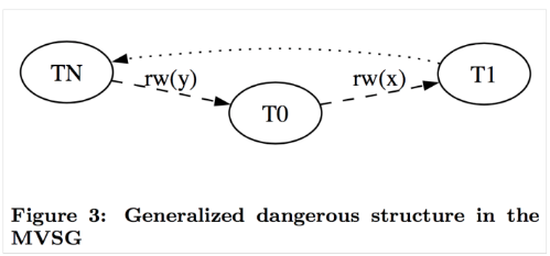 这个条件是只要有两个连续的 rw 依赖就会放弃提交,即使没有成环。这个检查发生在读的时候如果发现读的版本和自己开始之前的版本不一致就会找到依赖的事务,构建一条入边,另一个事务构建一条出边,如果某个事务入边出边都有 rw 边,这个节点就会被作为嫌疑人。当然还有其他关于Serializable Snapshot Isolation(SSI)隔离的论文可以参考。