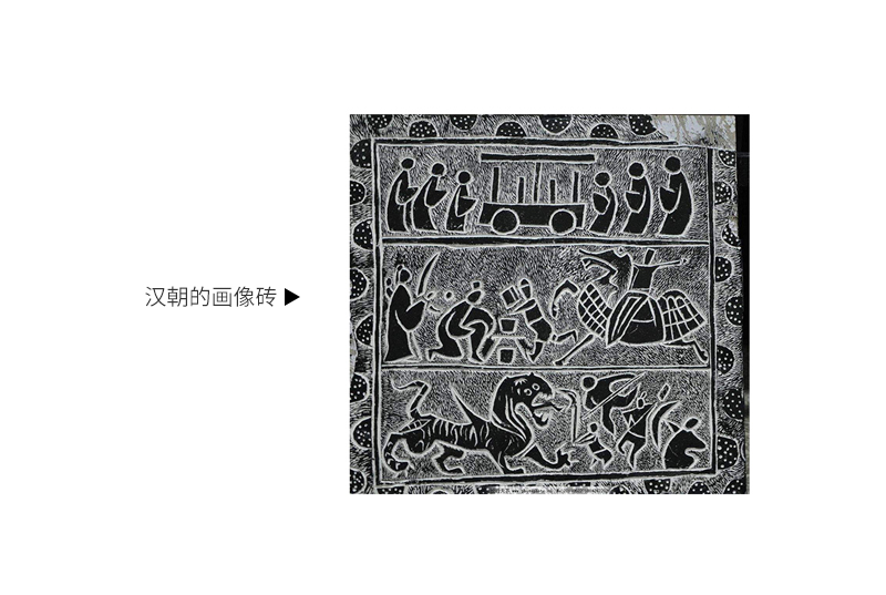 这种画像砖的制作方式很简单,就是用木材制造阳文(内容凸出),直接压到湿砖上面,等砖块干后,就形成了浮雕形式的凹形画像,当时这些砖主要记录生活中的故事,所以我们在图中可以看到一些关于打猎为题材的图像。