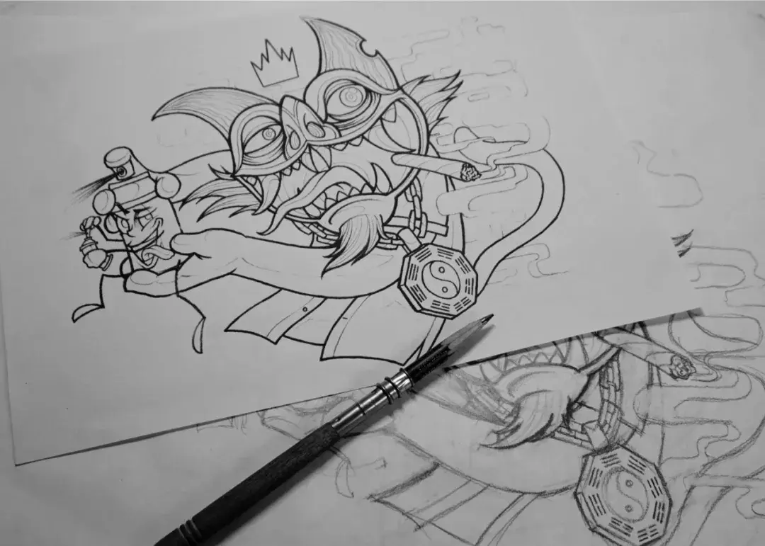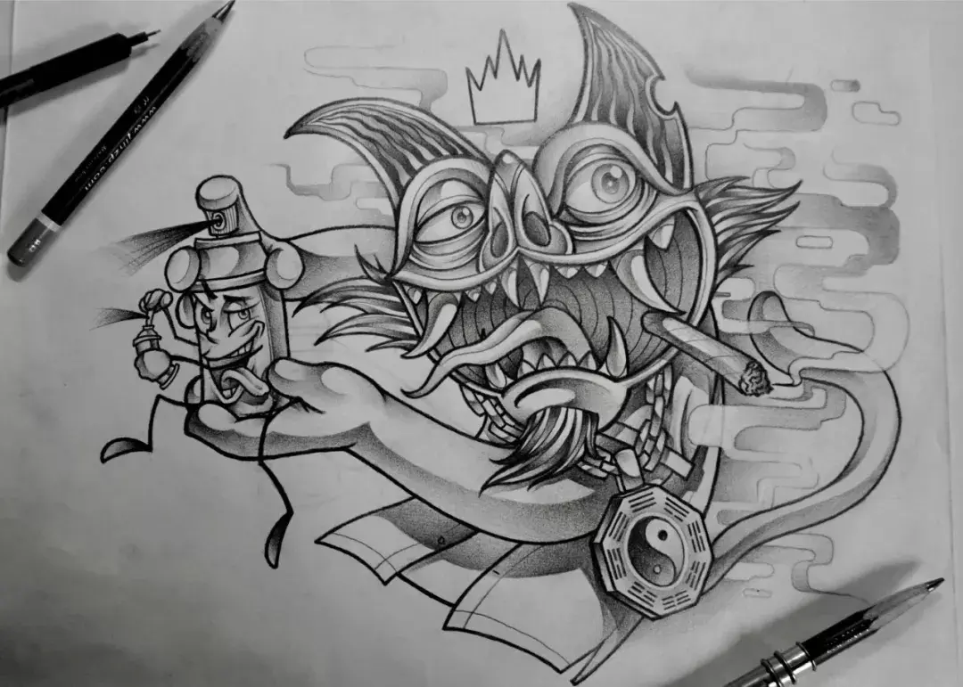 2 :另起一张纸,用拷贝台重新描一遍,在草稿的基础上继续细化,表情的细节,手中喷漆的细节等等,同时也要尽量保持画面整洁干净