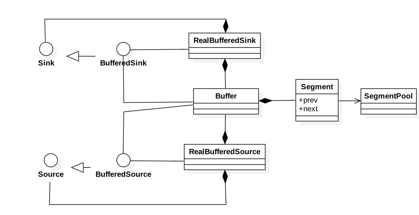 (4) RealBufferSink 和 RealBufferSource 是唯一返回给用户的写入与读取实例。其分别由 Sink + Buffer 和 Source + Buffer 的组合模式而成,用以完成真正的写入与读取。