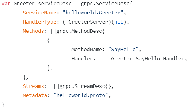 第一个参数表示你要向哪个协议服务器注册,第二个为业务逻辑,第三个为grpc serivce desc