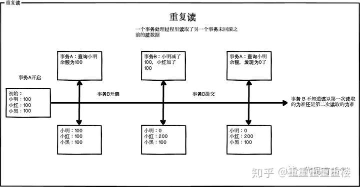 重复读:事务 A 中读取一条数据A1的值为1,在事务 A 还没提交之前,事务 B 修改了A1的值为2,这个时候事务 A 再次读取A1,发现值发生了改变,这就是重复读。