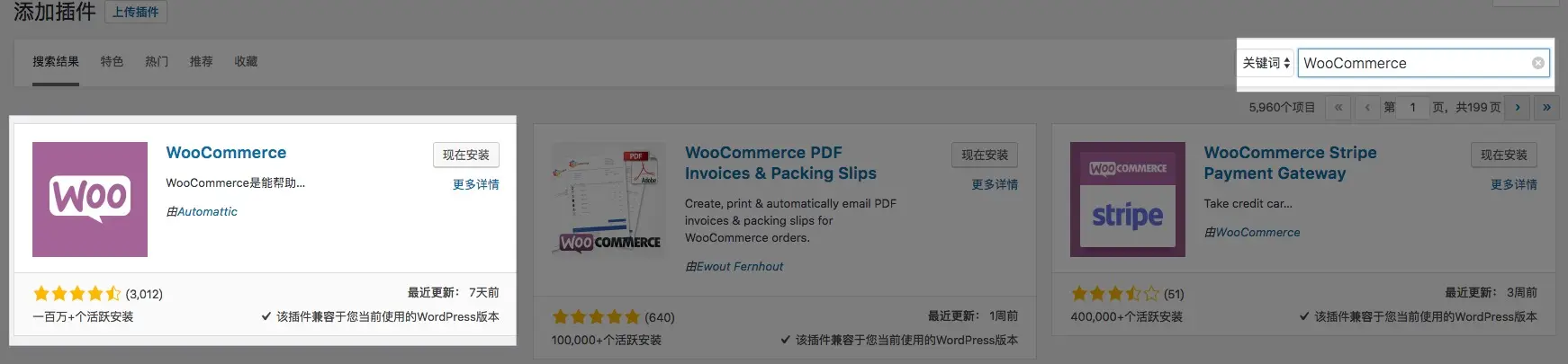 安装完 WordPress 后,接下来安装 WordPress 的商城插件 WooCommerce ,点击菜单栏中的「插件」-「安装插件」,访问到安装插件的界面,在界面右上角的搜索框内容输入 WooCommerce,并按下回车,可以搜索到 WooCommerce 。