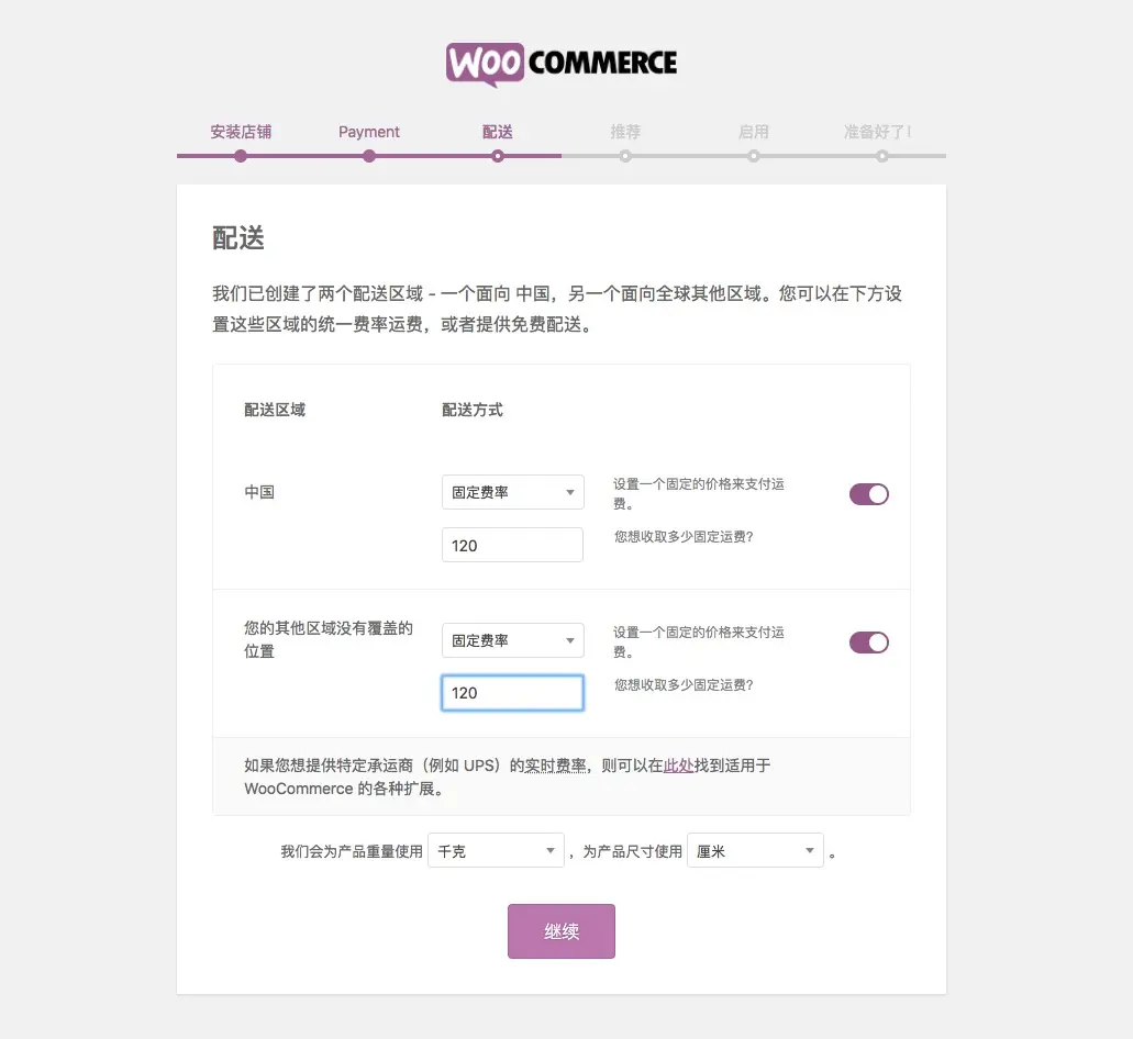 启用插件后, WooCommerce 会引导你进行初始化配置,根据提示对插件进行配置。