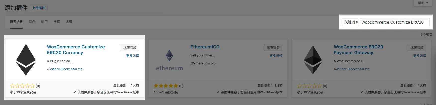 打开「插件」——「安装插件」,在关键词中输入 「Woocommerce Customize ERC20 Currency」并回车。