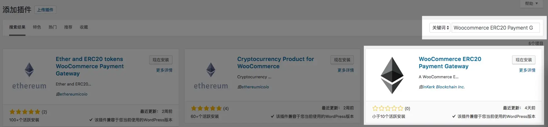 接下来,我们来安装 Woocommerce ERC20 Payment Gateway 来开启站点的 ERC20 Token 的支付支持。