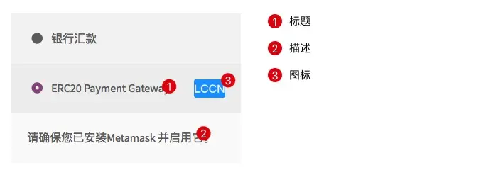 描述会展示在支付方式的下方,同样的,你可以设置为 「使用 LCCN 支付费用」,此外,还建议你在此引导顾客安装、并打开 Metask ,切换到主网络,确保后续支付。